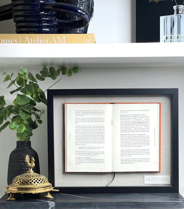 A unique way to display a book! This is such a special way to showcase your transformation journey by displaying this Manifestation Book that had such an impact in my life. This will feature a custom placard with a quote that is the most meaningful and touching for the recipient. The book will be open to whichever part of the book that quote appears. A great addition to either your wall, table or shelf decor! A great gift as well!